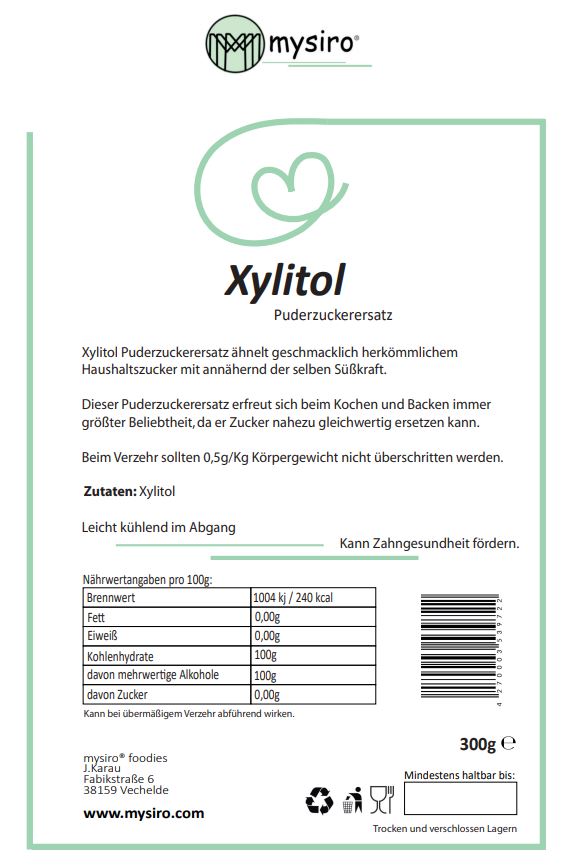 mysiro® Xylitol Puderzuckersatz ( Birkenzucker ) wirkt abführend, wenn die Einnahme von 0,5g pro Kilogramm Körpergewicht überschritten wird.